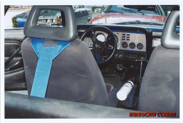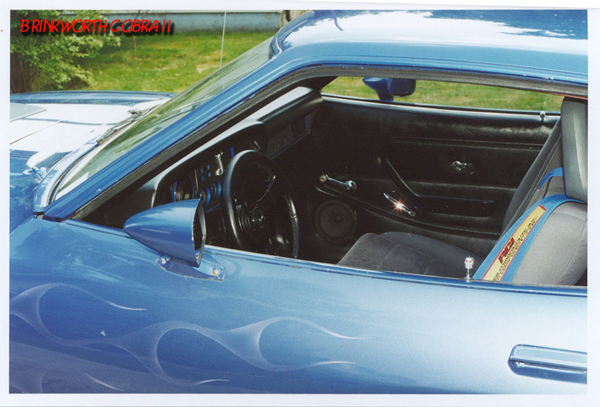 dash with airbrushed violet flames with Custom Cobra gauges, Grant GT steering wheel matching the black and grey interior.